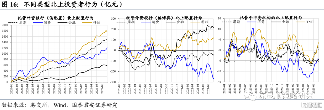 不同类型北上投资者行为:配置型外资重配科技与消费,周期流入放缓。针对2021Q2,通过划分不同托管类型的北上投资者的A股配置行为,我们可以看到:1)配置型投资者,主要净流入科技与消费板块,分别达343.48亿元和368.93亿元。尤其是,配置型自2020H2卖出消费以来,2021Q2开始重新买入消费。同时,自2020H2流入周期后,2021Q2周期流入开始放缓。2)交易型投资者,主要净买入科技与金融板块,分别达63.97亿元和52.4亿元。3)托管于中资机构的北上投资者,在5月之后再次全面买入各类行业。值得注意的是,当下发生的变化在于部分超跌的消费板块,配置型投资者已开始增配,比如美的,反映出此前成本受制预期边际缓和的中下游产业再次回到海外投资者视野。