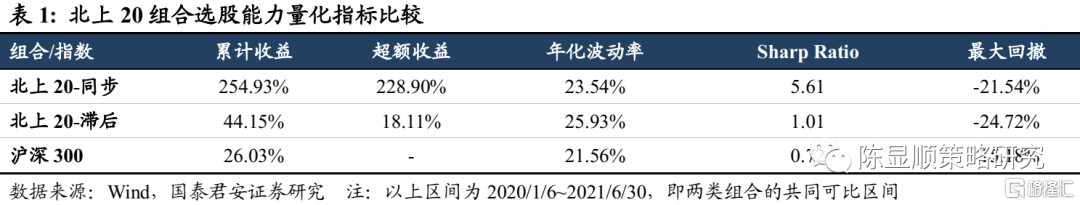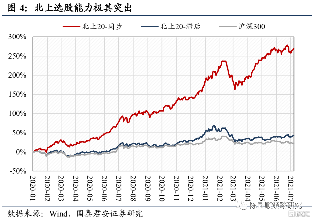北上资金的领先与制胜:更加关注高盈利弹性与成长性。从投资偏好来看,成长性关注度提升,一方面,科技成长行业净流入数量边际抬升;另一方面,在ROE稳定偏高的倾向下,更加关注EPS同比高增标的,反映了从投资的角度,高盈利弹性EPS与成长性g兼具的特征成为当下股票投资的核心风格。从选股与投资收益能力来看,前瞻性极强。其中,2020Q1~2021Q2,“北上20-同步”组合累计超额收益率达230%,Sharp Ratio达5.61,远高于同期沪深300指数表现。