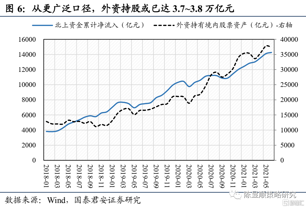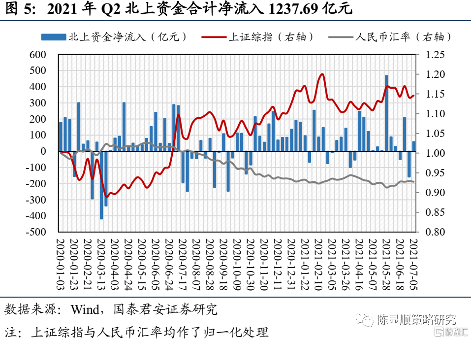 2021年Q2北上资金净流入1237.69亿元,持股规模创历史新高,达到2.6万亿元。其中,2021年4月-6月北上资金净流入分别为526.07亿元、557.76亿元、153.85亿元。从单季度看,北上资金流入规模仅次于2019Q4、2020Q2和2019Q3。同时,得益于人民币汇率的走强以及A股市场表现,Q2北上持股达到单季新高。截至二季度末,北上投资者合计持有A股市值规模已达2.6万亿元,占流通A股的3.79%,较Q1末上升2660.22亿元。此外,根据我们的估算,包含更广泛的外资口径的境外机构与个人持有股票资产规模有望达到3.7~3.8万亿元,约占流通A股市值的5.4%左右。从持有规模的角度,北上投资者对A股的定价权不断深化,A股的国际化进程继续向前推进。