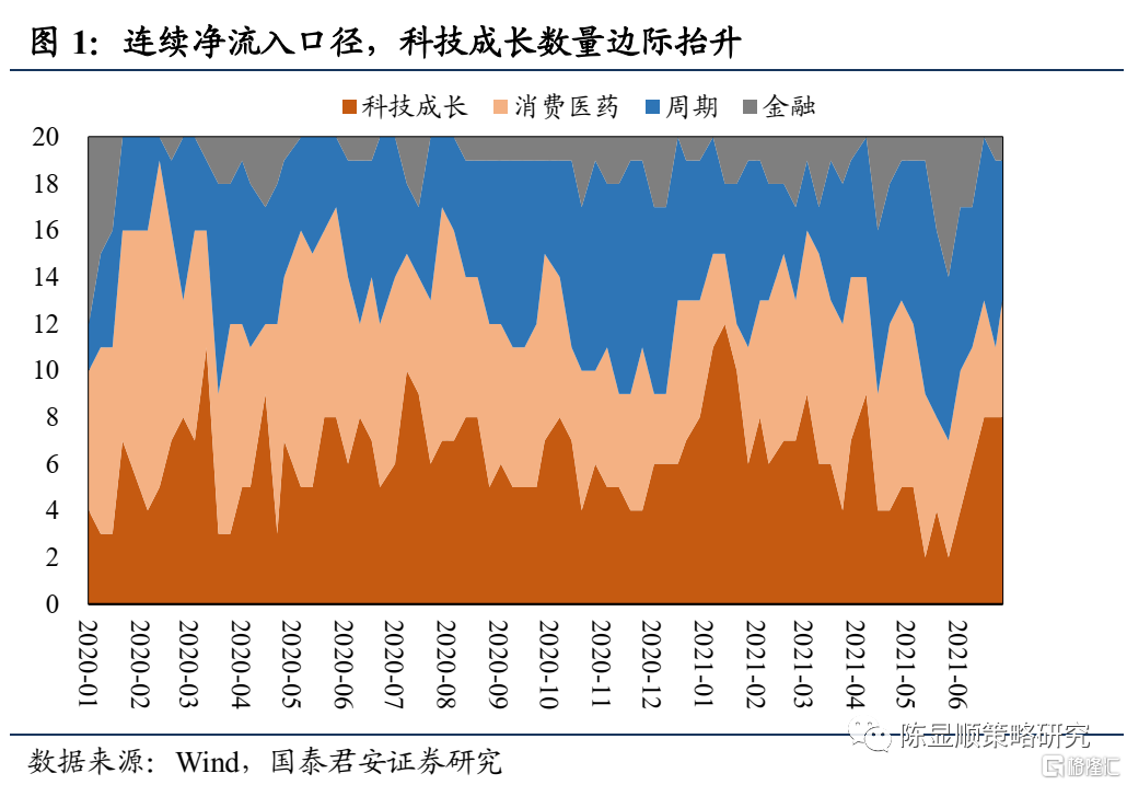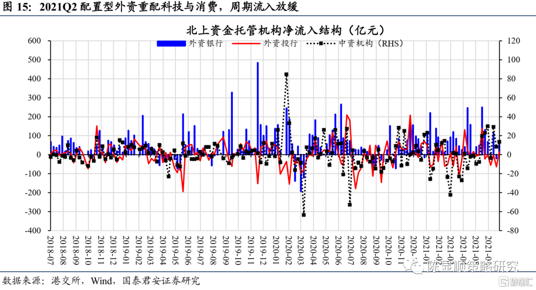 新的线索:配置型外资重配科技,布局超跌消费,周期流入放缓。通过划分不同托管类型的北上投资者的A股配置行为,可以看到:1)配置型投资者,主要净流入科技与消费板块,尤其在自2020H2卖出消费以来,2021Q2开始重新买入消费。同时,自2020H2流入周期后,2021Q2周期流入开始放缓。2)交易型投资者,主要净买入科技与金融板块。值得注意的是,配置型投资者已开始净流入部分超跌的消费板块,反映出此前成本受制预期边际缓和的板块再次回归投资视野。