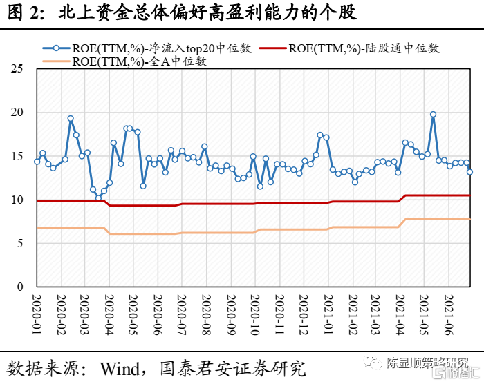偏好盈利能力突出的个股,其中, 2020Q1~2021Q2,“北上20” ROE(TTM)周度平均值为14.34%,而同期陆股通标的与全A平均值分别为9.77%和6.70%。尤其是,2021Q2单季度内,“北上20” ROE(TTM)平均值达15.14%,较陆股通标的均值高出4.65pct。