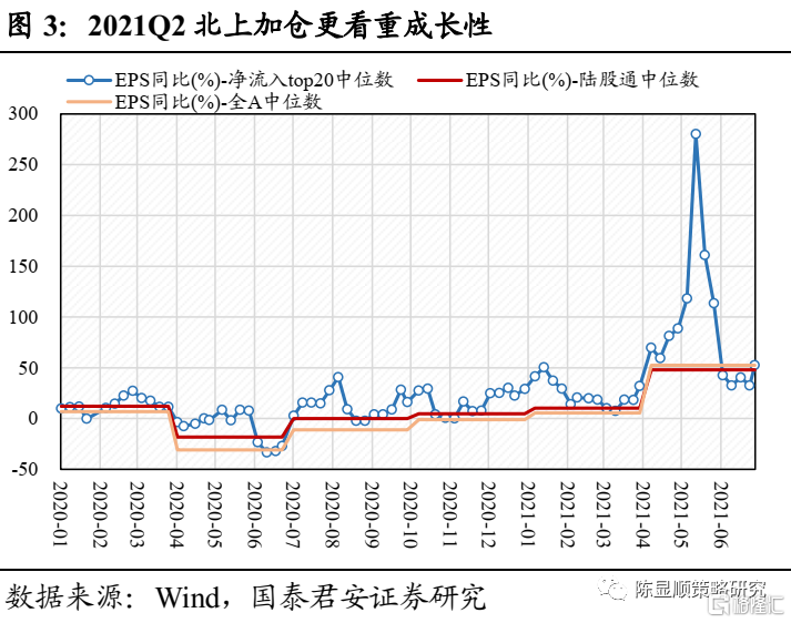 近期更加关注成长性,2020Q1~2021Q2,“北上20”EPS同比数值总体持续高于同期陆股通标的,但在2021Q2期间,该差值一度大幅上升。我们认为,随着增长和盈利的全局性放缓、PPI通胀见顶回落以及信用政策易松难紧,从投资的角度,高盈利弹性EPS与成长性g兼具的特征成为当下股票投资的核心风格。