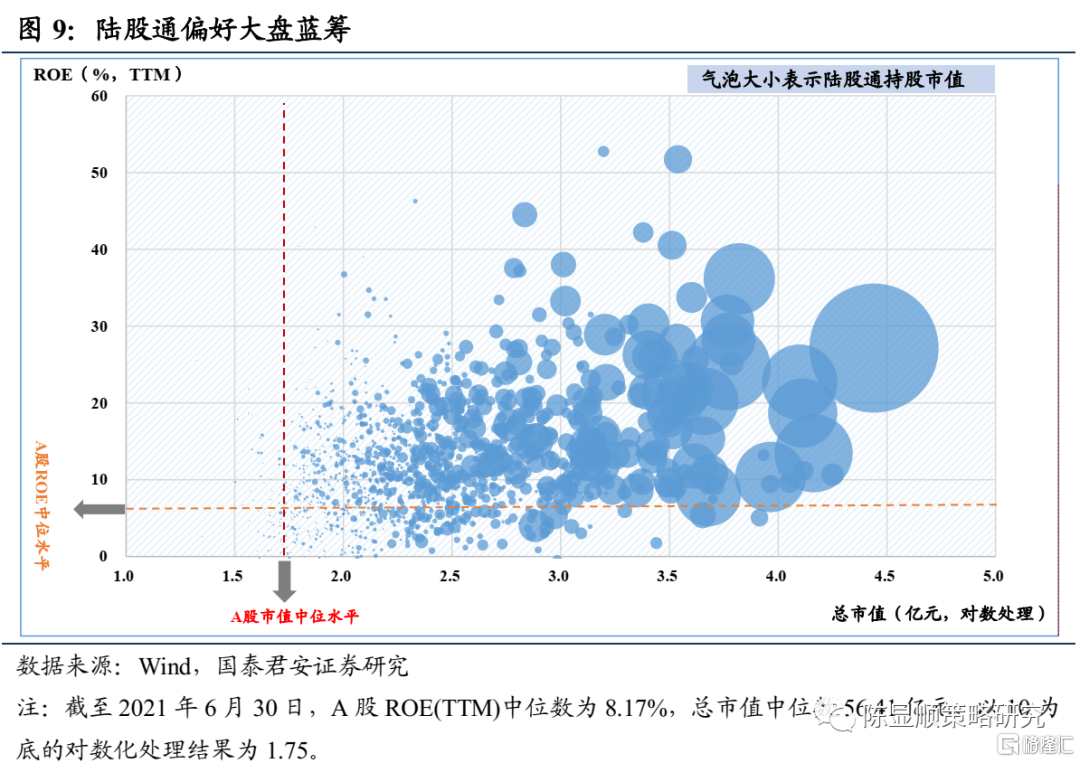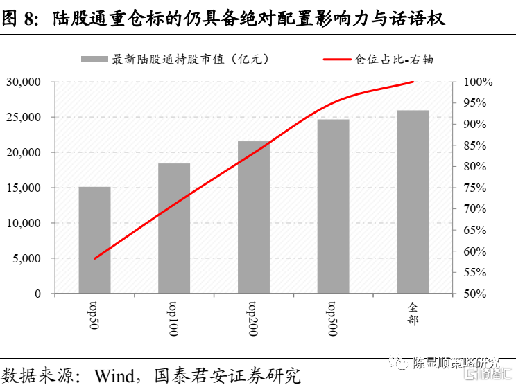 规模与盈利兼顾,显著偏好大盘蓝筹。我们将A股市值与ROE按中位水平划分,可以发现,陆股通标的落在第一象限的比例超60%,其中重仓个股的分布特征尤为显著,即市值偏高、盈利能力强的大盘蓝筹。值得注意的是,陆股通重仓Top10中,共有9只“茅指数”成分股;TOP100中,共有36只。这意味着,陆股通存量资金显著影响以“茅指数”为代表的大盘蓝筹。