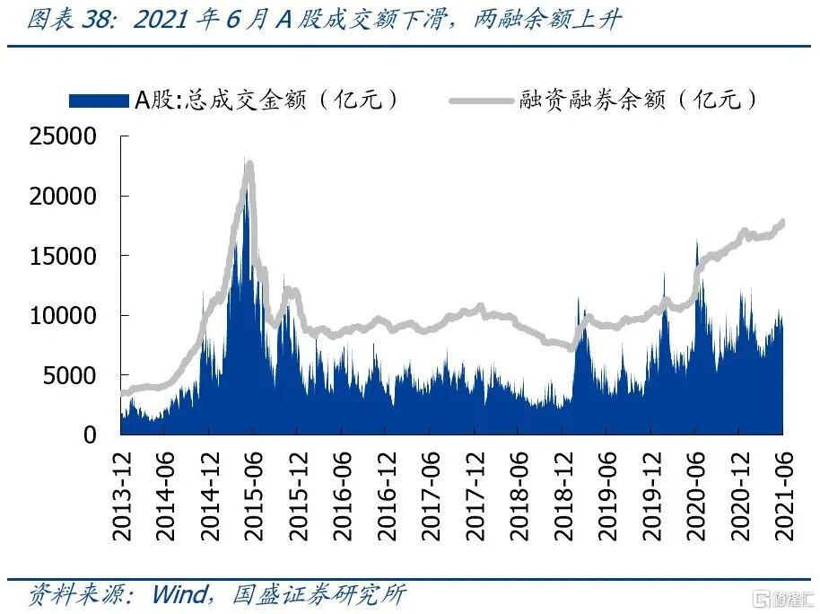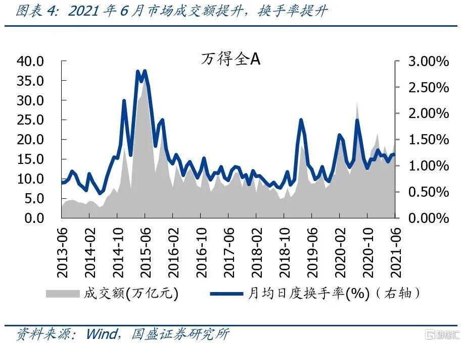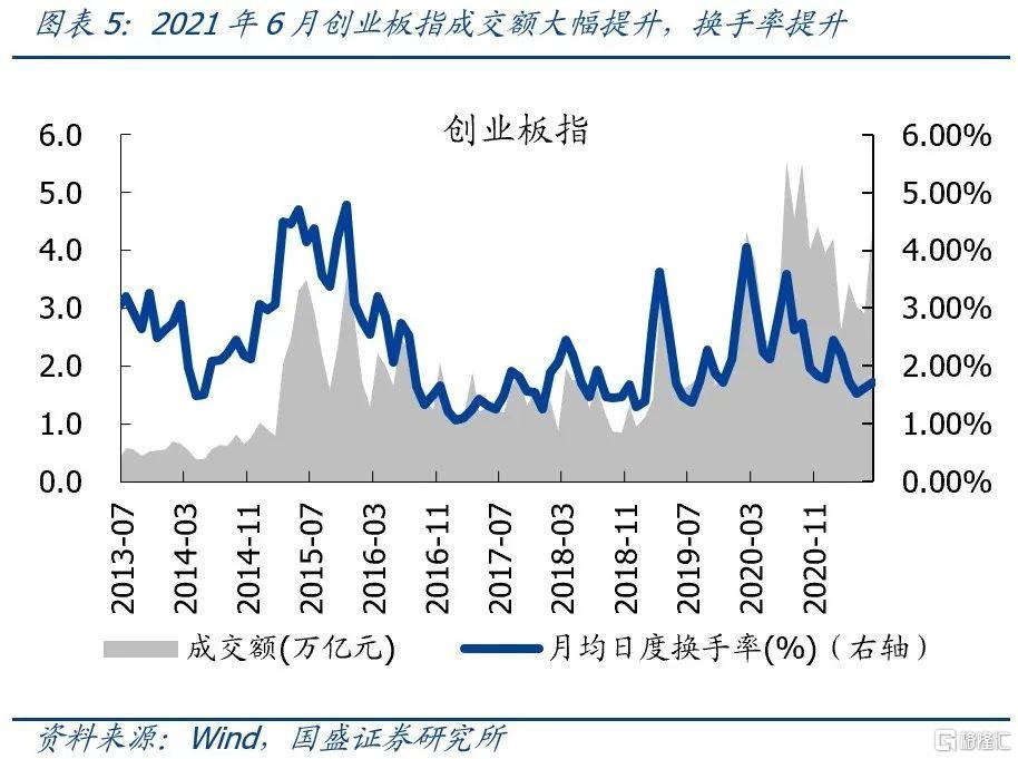 2021年6月,市场成交额提升,换手率提升。具体来看,万得全A成交额由上月的15.7万亿元上升至20.6万亿元,日均换手率由上月的1.20%上升至1.22%;创业板指成交额由上月的2.9万亿元大幅上升至4.6万亿元,日均换手率由上月的1.62%提升至1.72%。