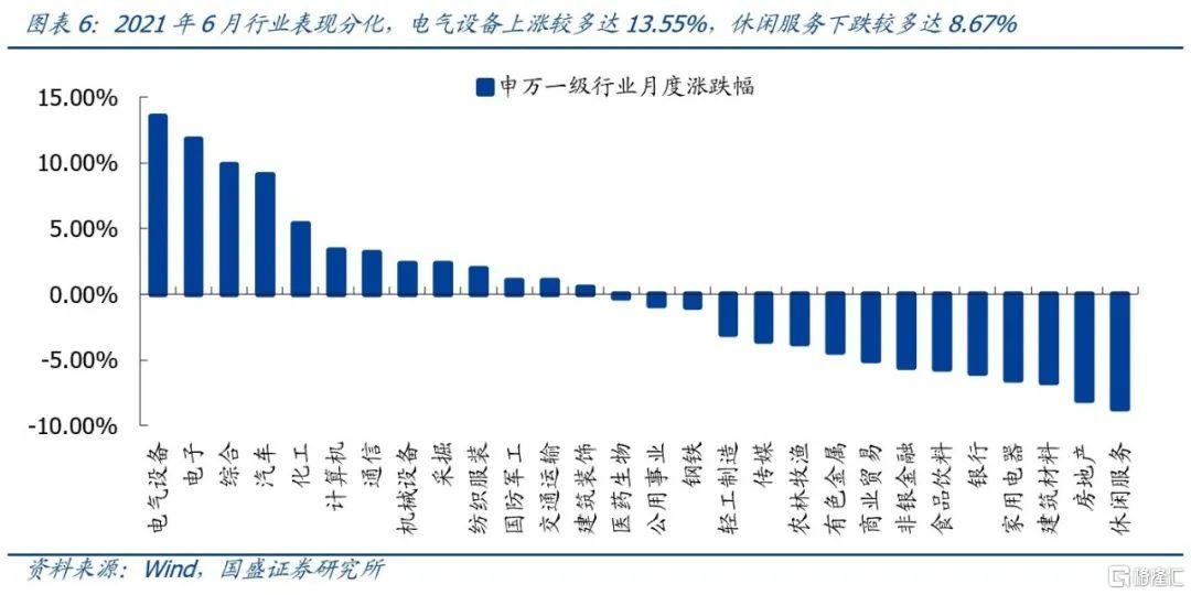 2021年6月,电气设备(13.55%)、电子(11.82%)、综合(9.86%)、汽车(9.07%)及化工(5.37%)涨幅居前;休闲服务(-8.67%)、房地产(-8.06%)、建筑材料(-6.73%)、家用电器(-6.53%)及银行(-5.99%)跌幅较大。