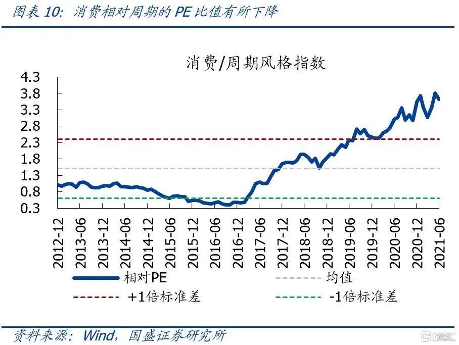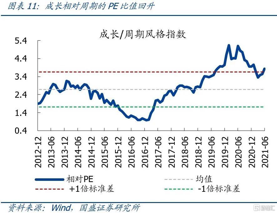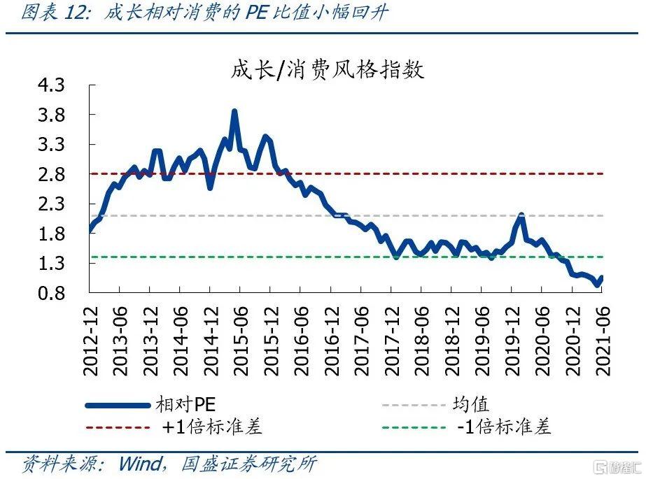 消费相对周期的PE比值为3.61,较上月有所下降,但仍远高于2012年至今均值的正一倍标准差(相对PE均值为1.51,+1倍标准差为2.41,-1倍标准差为0.61);成长相对周期的PE比值为3.84,较上月有所上升,且高于2012年至今均值的正一倍标准差(相对PE均值为2.68,+1倍标准差为3.65,-1倍标准差为1.72);成长相对消费的PE比值为1.06,较上月有所上升,低于2012年至今均值的负一倍标准差(相对PE均值为2.10,+1倍标准差为2.80,-1倍标准差为1.40)。