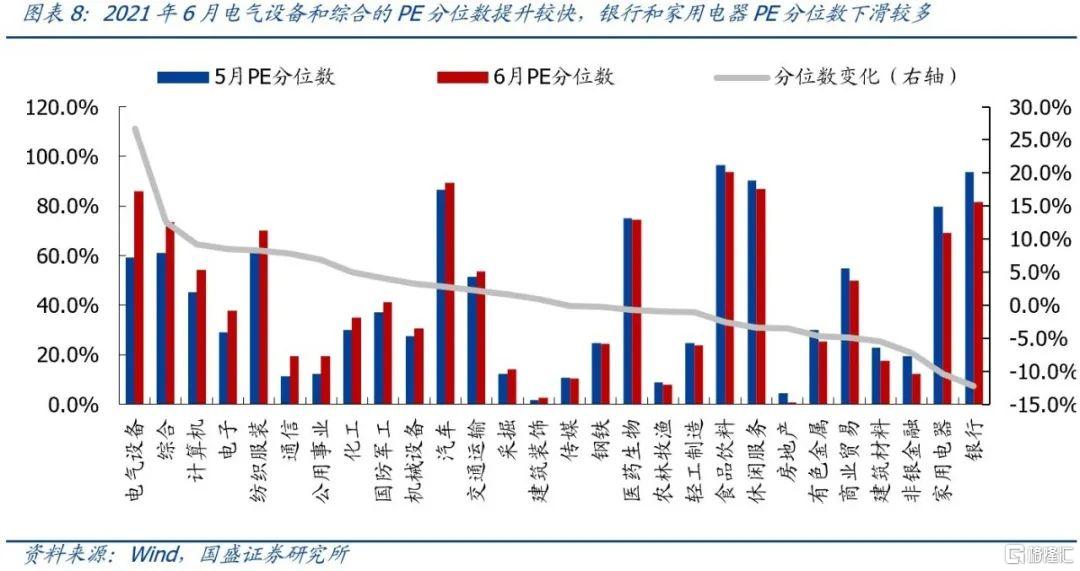 从PE分位数的变化来看,28个行业中有14个行业估值分位数较上月有所提升,电气设备、综合、计算机、电子及纺织服装的PE分位提升较快;银行、家用电器、非银金融、建筑材料及商业贸易的PE分位下滑较多。