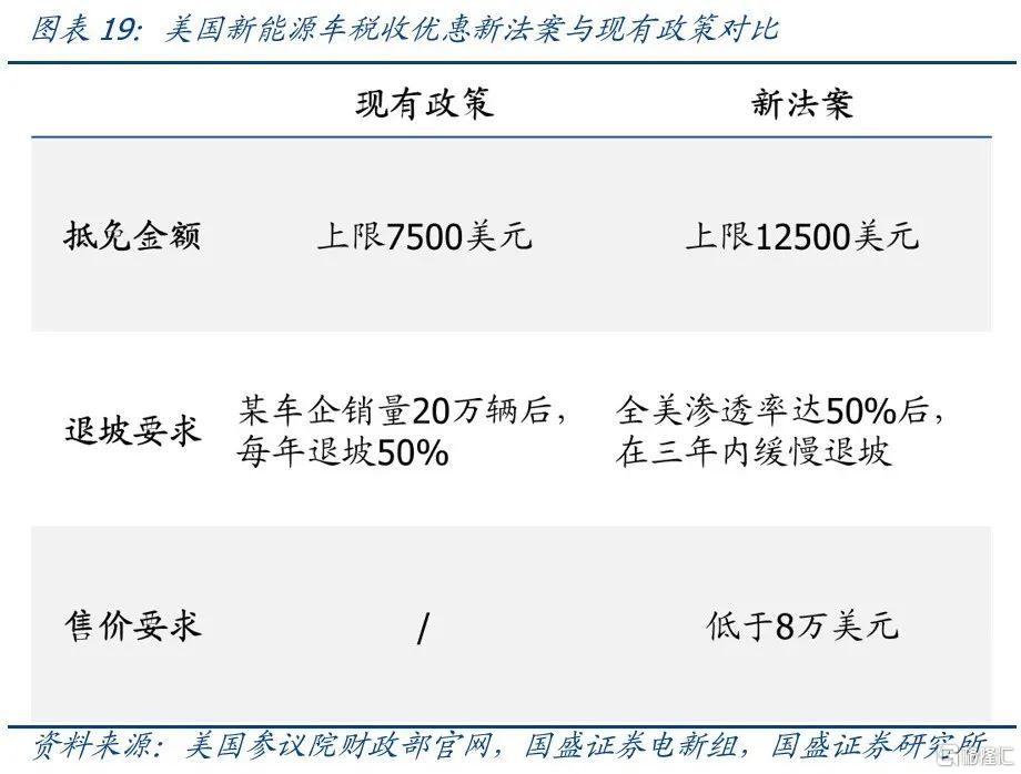 美国电动车税收抵免政策再获推进,行业利好政策频传驱动行业β行情。美国参议院财政委员会提出电动车税收抵免新法案,主要内容包括:(1)单车补贴金额上限由原有的7500美元提高到12500美元。(2)取消车企累计销量达20万辆后补贴在一年内退坡的原有限制。更改为全美电动车渗透率达50%后,退税补贴在三年内逐步退坡。新法案通过概率相对较大,若法案正式落地,在高补贴的刺激下将带动较大的销售弹性,美国市场或将成为继欧洲市场后的下一个产业增长点。