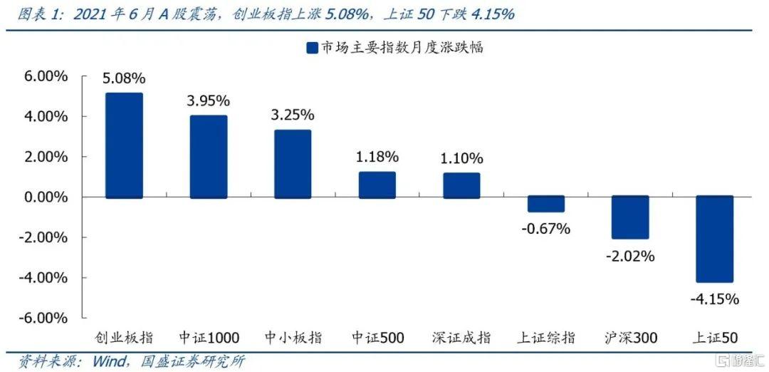 2021年6月,A股市场震荡偏强,指数涨跌互现。创业板指和中证1000涨幅较大,月度涨跌幅分别为5.08%和3.95%;上证50和沪深300跌幅较大,月度涨跌幅分别为-4.15%和-2.02%。