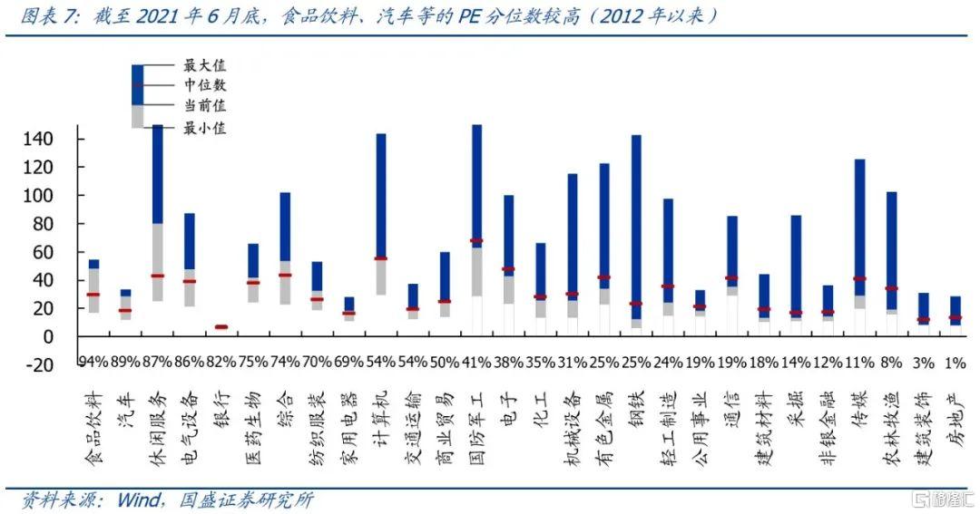 截至2021年6月底,28个申万一级行业中11个行业PE(TTM)超过中位数,食品饮料(93.86%)、汽车(89.47%)、休闲服务(86.84%)、电气设备(85.96%)及银行(81.58%)估值分位较高;房地产(0.88%)、建筑装饰(2.63%)、农林牧渔(7.89%)、传媒(10.53%)及非银金融(12.28%)估值分位较低。