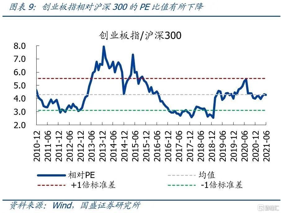 2021年6月,创业板指相对沪深300的PE比值为4.27,较上月的4.32有所下降,略低于均值水平。(相对PE均值为4.31)。创业板指本月涨幅虽然大于沪深300,但近期临近季报期,中报业绩的披露导致相对PE下降。