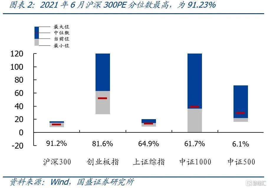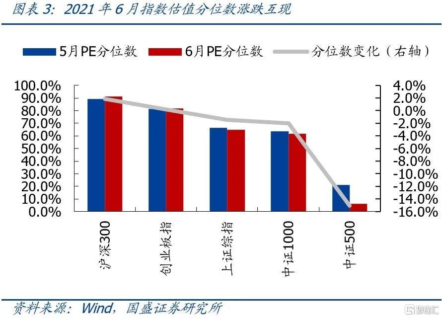 截至2021年6月底,沪深300、创业板指、上证综指、中证1000及中证500的PE(TTM)分别为14.77、63.11、14.45、36.35和22.01;其中沪深300估值分位较高,为91.23%,中证500估值分位较低,为6.14%。当前沪深300、创业板指和上证综指估值在中位数以上,中证1000和中证500估值在中位数以下(2012年以来数据)。