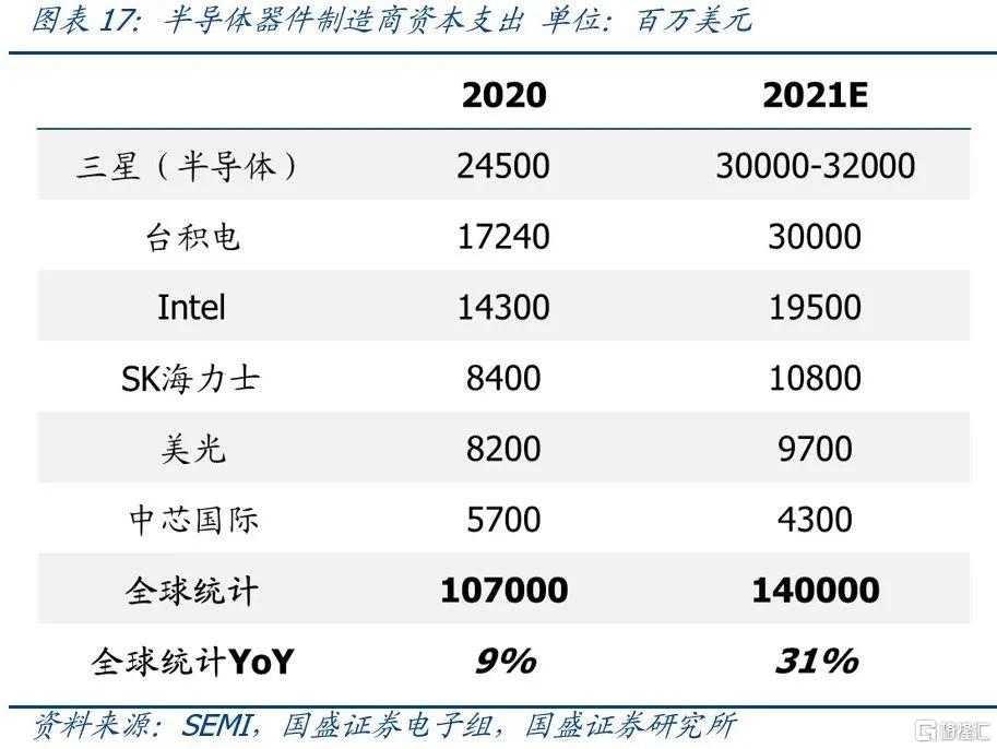 半导体行业进入历史级景气。受汽车、服务器、物联网、5G等数字经济智能应用强劲推动,半导体市场自2019年以来进入有望连续三年的超级景气周期,WSTS、IDC等均预计2021年全球半导体市场规模突破5000亿美元。2021年全球半导体制造商资本开支大幅增长,当前的行业热潮有望成为新一轮产业跃升的开端。根据SEMI,2020年全球半导体资本开支规模约1070亿美元,2021年预计同比增长31%。