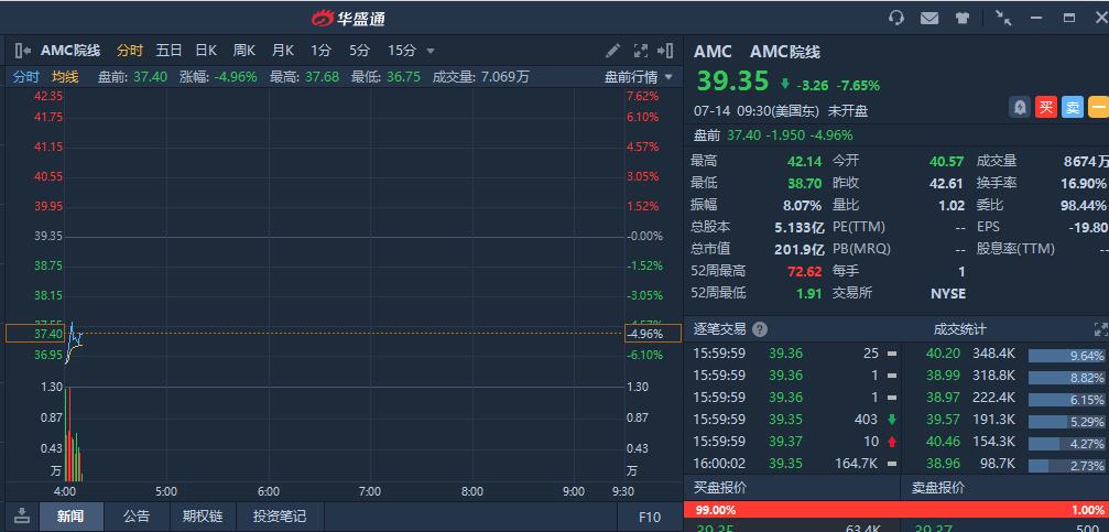 华盛资讯7月14日消息,美股盘前,WSB概念股下挫,AMC院线跌近5%,黑莓跌近2%。据悉,彭博追踪的37只所谓“网红股”(meme stocks)周二下跌4.2%,较6月8日高点已下跌23%。