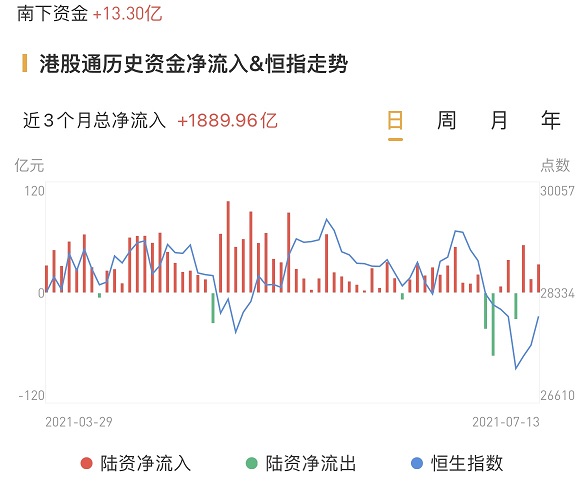 南下资金今日净流入港股13.30亿港元,上一个交易日净流入30.69亿港元。