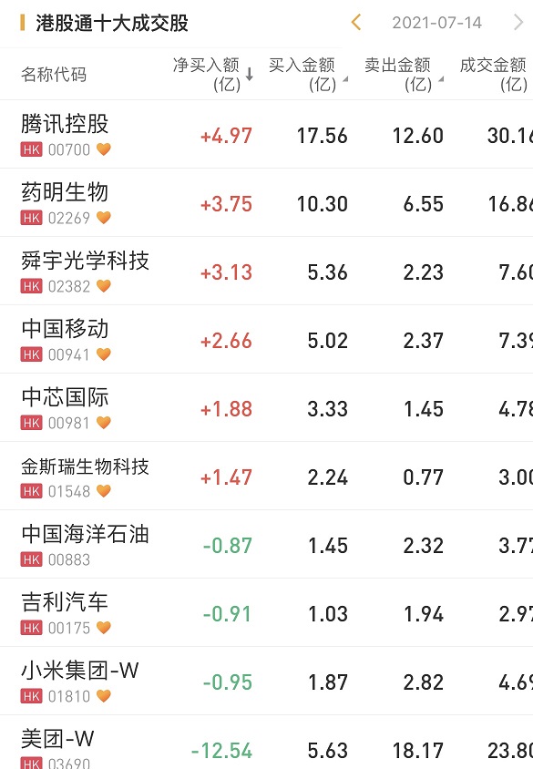 个股方面,今日南下资金净买入腾讯控股4.97亿港元,为今日买入之最,昨日净买入腾讯控股7.87亿港元。此外,南下资金净买入药明生物3.75亿港元,净买入舜宇光学科技3.13亿港元。