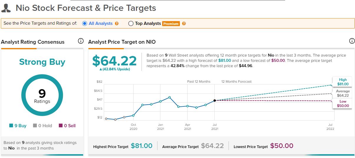 总体而言,根据华尔街的共识,蔚来拥有罕见的积极前景。 在过去的三个月里,蔚来获得了 9 个“买入”评级,使共识评级为“强烈买入”。 分析师给出的平均目标价为 64.22 美元,相当于蔚来当前的股价有约 40% 的上涨潜力。