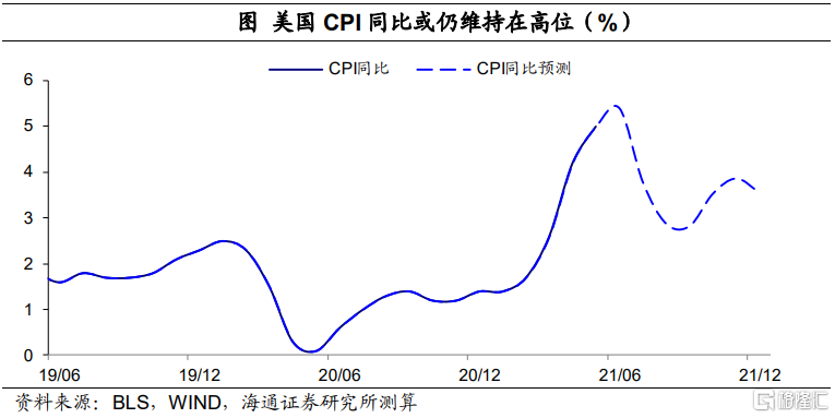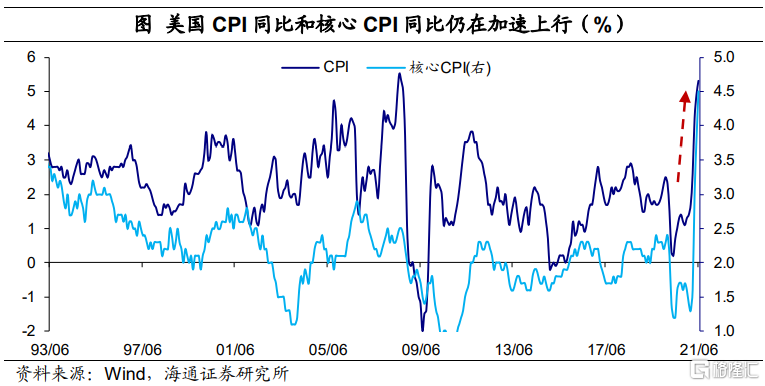 胀持续超预期。6月美国CPI同比上升至5.4%,超市场预期(WIND口径)的4.8%,续创2008年8月以来新高;此外,CPI环比0.9%,创2011年3月以来新高。剔除食品和能源影响后,6月美国核心CPI同比上升至4.5%,超市场预期的4.0%,创1991年11月以来新高;此外,核心CPI环比0.8%,与4月持平,为1991年1月以来新高。