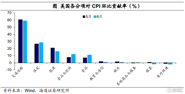 什么在推动通胀持续超预期?从大类来看,推动通胀超预期的仍是交通运输、住宅以及能源项;区别在于能源贡献大幅下滑,交通运输贡献略有下滑,但仍是主要贡献;而住宅贡献在上行,或与经济防控放松后,服务活动加强有关。6月住宅对CPI环比的贡献率上升至28%(上月为26%);交通运输对CPI环比的贡献率放缓至59%(上月为61%);而能源通胀对CPI环比的贡献率放缓至16%(上月为21%)。此外,食品对CPI环比的贡献率也上升4个百分点至11%,或与美国近期干旱天气有关。