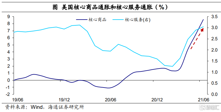 美国6月通胀再超预期,CPI同比续创2008年8月以来新高,而核心CPI同比也创1991年11月以来新高。其中,商品通胀对CPI同比的贡献超6成,尤其是耐用品通胀创历史新高。具体来看,交通运输、住宅以及能源是主要驱动力,不过能源对CPI环比的贡献有所下滑,而住宅对CPI环比的贡献在上升,或与美国经济防控放松后,服务活动逐步加强有关。