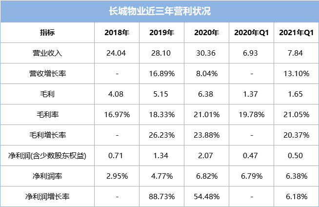 据招股书披露,2018-2020年,长城物业集团实现营业收入分别为24.04亿元、28.1亿元、30.4亿元,2019年营收增幅16.9%,2020年则为8%;实现年度利润分别为7137万元、1.34亿元、2亿元,2019年和2020年的增速分别为88%、54%。