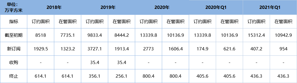 同期合约面积为0.98亿平方米、1.33亿平方米、1.53亿平方米,每年新增合约面积为3530万平方米、1988.7万平方米。值得注意的是,2021年第一季度,长城物业集团的合约面积甚至出现了负增长,第一季度合约面积较2020年末减少了29.1万平方米。