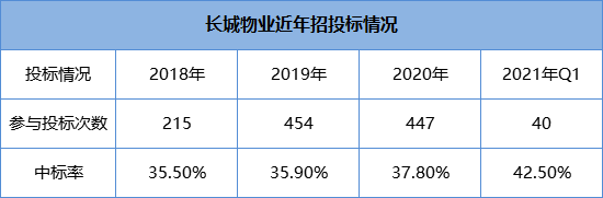 而在主动招投标市场方面,长城物业集团表现则较为积极,中标率有逐年提升的趋势,但整体来看仍处于较低位,市场竞争力仍有待提高。