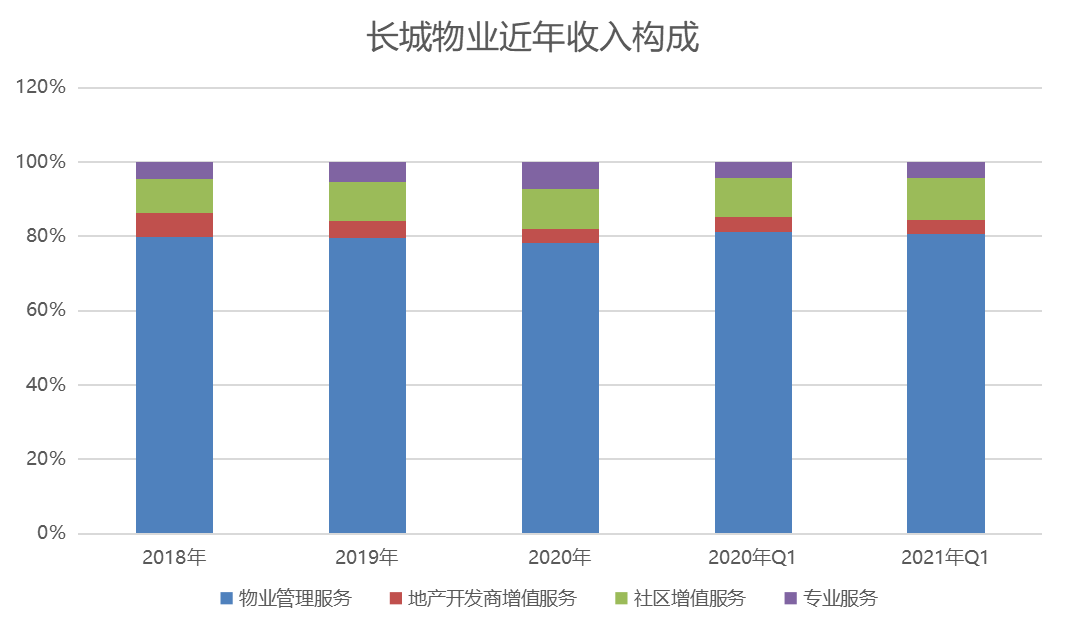 据观点指数此前研究,目前市场上的物业服务企业的增值服务与公司总营业收入的平均比值为35%左右。对比之下,长城物业集团依靠基础物业费的收入占比高达78.2%,收入结构较为单一,且地产开发商增值服务2019年、2020年甚至出现了负增长。