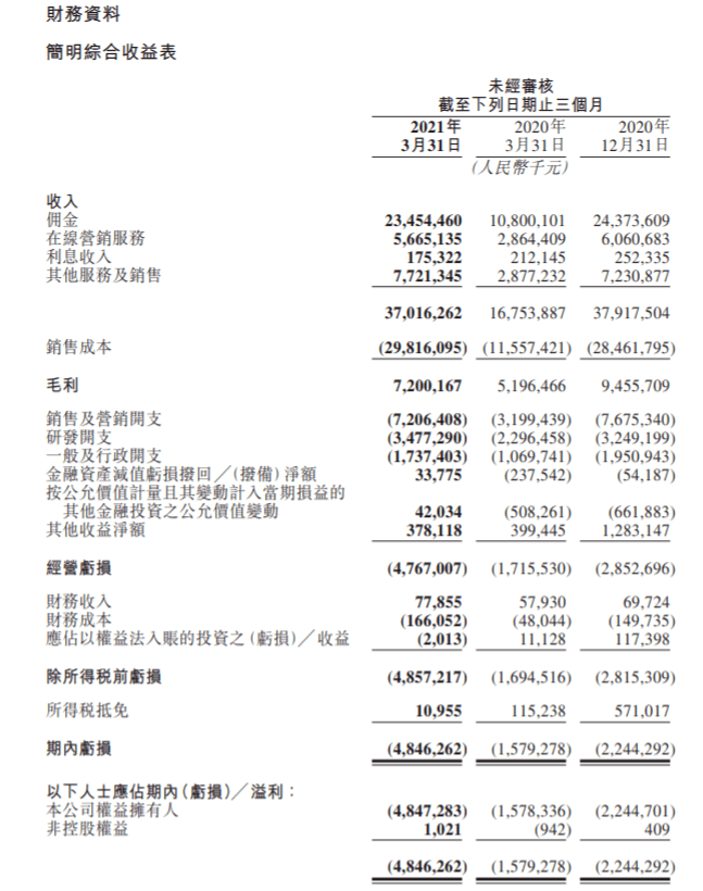 财报显示,2021年第一季度公司营收370亿元,较去年疫情期间同比增长120.9%;期内亏损为48.46亿元,同比扩大超过200%。