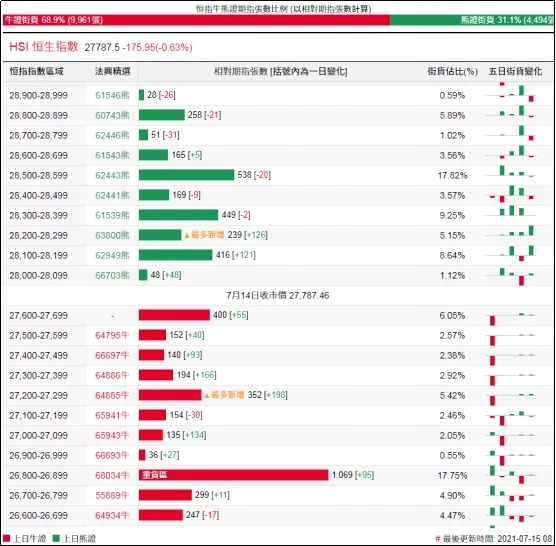 街货分布方面,至周三,恒指牛证街货重货区在收回价26800点至27300点之间,累计相当约1746张期指合约;恒指熊证街货重货区仍在收回价28100点至28600点之间,累计相当约1811张期指合约。