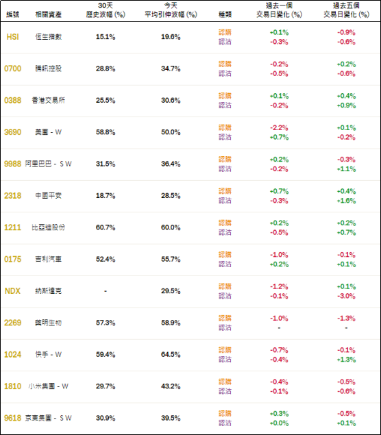 周三恒指相关权证的平均引伸波幅约19.6%,按日轻微调升。个股方面,美团、吉利汽车、纳斯达克、药明生物及快手等相关认购证的引申波幅按日调降显著;相反,港交所、阿里、平安、比迪等相关认购证的引申波幅按日调升。