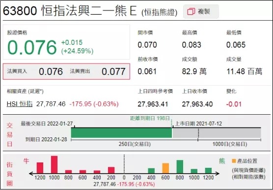 1、强势轮证:恒指法兴二一熊(63800.HK),周三上涨24.59%;