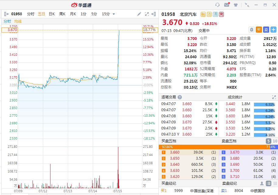 华盛资讯7月15日消息,中信建投日前披露了关于北京汽车股份有限公司首次公开发行A股股票并在主板上市辅导工作的报告。北汽有关人士对此消息予以确认,表示目前是一种准备回归A股的状态。受消息驱动,北京汽车早盘发力上涨,截止发稿,北京汽车上涨16.51%,现报每股3.67港元,总市值294亿港元,成交额超1亿港元。