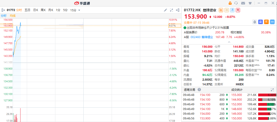 截至发稿,赣锋锂业涨9.07%,现报153.9港元每股,暂成交4.904亿港元,最新总市值2212亿港元。值得注意的是,赣锋锂业盘中最高见156港元,创历史新高。