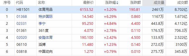 华盛资讯7月15日消息,体育用品股普涨,截止发稿,特步国际上涨6.29%;李宁上涨4.84%;361度上涨2.78%;安踏体育上涨2.42%;滔博上涨1.23%;中国动向上涨0.79%。
