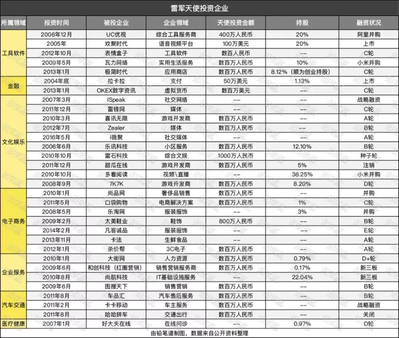 在创办小米和顺为资本之前,创办过卓越网、带领金山软件IPO的雷军早已是天使投资圈内著名的投资人,虽然他曾因为QQ两三百万的价格太贵拒绝了马化腾,也曾经因为觉得马云满嘴跑火车像是传销的拒绝了投资淘宝,但他在投资方面依然很成功,UC、欢聚时代、拉卡拉、凡客、乐淘等项目都有他的参与,尤其是投资UC,让他获得了1000倍的投资回报率。