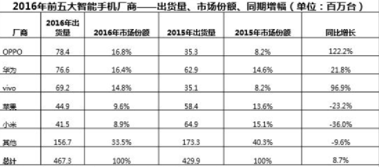 而这波机遇被线下“渠道之王”OPPO和vivo接住了。尤其是OPPO,2015年时市场份额只有8.2%,到2016年一下子就跳到了16.8%,超过了华为。
