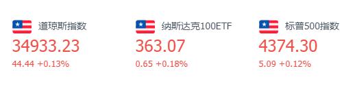 截至收盘,三大股指涨跌互现,道琼斯指数涨44.44点,涨幅0.13%,报34933.23点;标普500指数涨5.09点,涨幅0.12%,报4374.30点;纳斯达克综合指数跌32.7点,跌幅0.22%,报14644.95点。