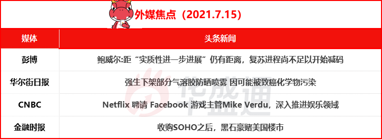 美国6月份核心PPI环比涨幅创下历史最高纪录,表明企业面临越来越大的转嫁成本压力。美国前财长姆努钦称,美联储应当立即削减资产购买计划,谨防通胀失控。贝莱德CEO认为,美国处于历史高位的通胀率不会是暂时现象。美国银行CEO称经济几乎已经完全恢复到疫情前水平。
