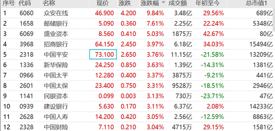 银行保险股集体拉升,众安在线涨近10%,邮储涨近8%,招行涨近4%,新华保险、中国太平、中国太保等涨超3%,建行涨超3%。