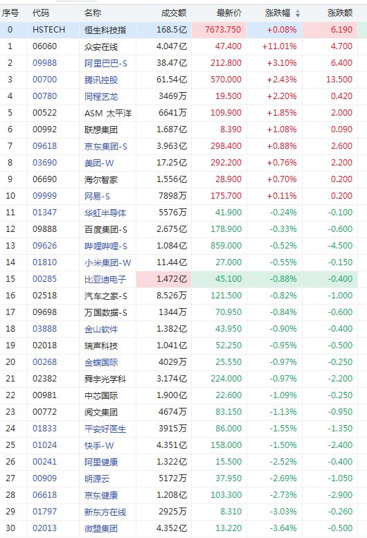 众安在线大涨逾11%,上半年原保费收入98.35亿元 同比增长45.42%;阿里巴巴涨超3%,腾讯涨超2%,此前传出两家公司考虑相互开放生态系统,双方都在分别制定放松限制的计划;同程艺龙涨超2%,ASM太平洋涨超1%。