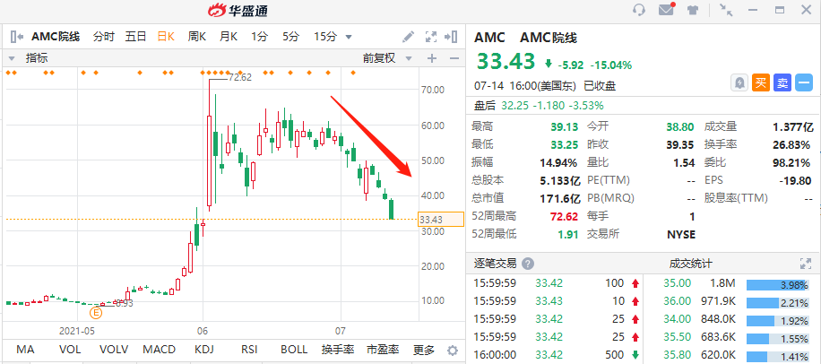 几家欢喜几家愁!作为影院运营商,AMC院线最近的日子却不好过。行情数据显示,AMC周三连续第四个交易日下跌,收于33.43美元,单日跌幅高达15%,较6月初创下的72.62美元历史高点则已跌去了54%。该股早些时候一度跌至33.25美元,创下6月1日以来新低。