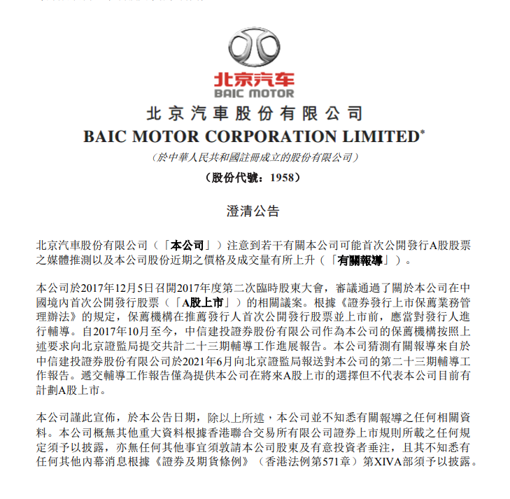 北京汽车在港交所公告称,北京汽车股份有限公司注意到若干有关本公司可能首次公开发行A股股票之媒体推测以及本公司股份近期之价格及成交量有所上升。本公司猜测有关报导来自于中信建投证券股份有限公司于2021年6月向北京证监局报送对本公司的第二十三期辅导工作报告。递交辅导工作报告仅为提供本公司在将来A股上市的选择但不代表本公司目前有计划A股上市。