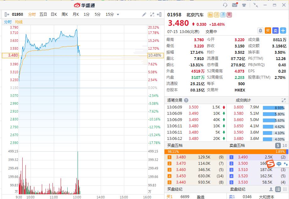 华盛资讯7月15日消息,北京汽车午后跳水,涨幅缩窄至10%,公司午间澄清称递交辅导材料不代表目前有回到A股上市计划。北京汽车午间收盘大涨18%,市值298亿港元。