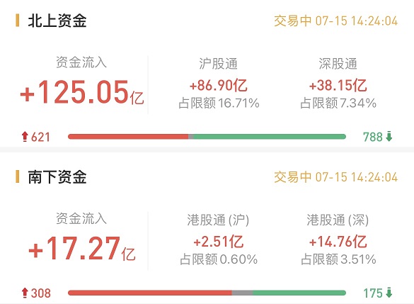 北上资金净买入125.05亿元。沪股通净买入86.90亿元,深股通净买入38.15亿元。