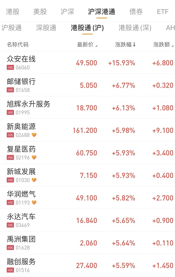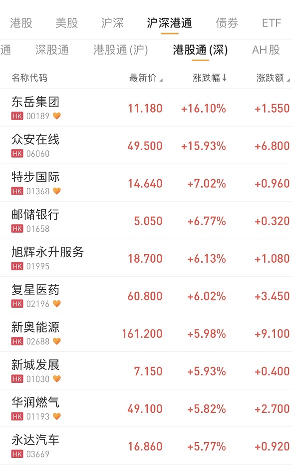 沪深两市成交额连续第11个交易日突破一万亿元。港股通(沪)、港股通(深)个股方面,东岳集团涨16.10%,众安在线涨15.93%,特步国际涨7.02%,新奥能源涨5.98%,复星医药涨5.93%。