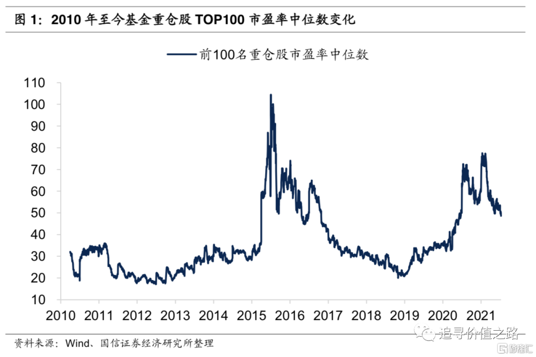 基金重仓股的估值水平自春节后以来快速下降,但仍然较高。截至2021年7月9日,前100名基金重仓股的市盈率中位数和市净率中位数分别为48.6和9.2,处于2010年至今的78%和92%历史分位点处。前200名、前300名、前400名重仓股的市盈率中位数分别为48.7倍、45.7倍、44.3倍,分别处在78%、77%、75%的历史分位数,估值普遍偏高。基金重仓股的估值水平自春节后以来快速下降,原因主要在PE(TTM)的分母计算上,由于重仓股的盈利能力较强,2021年Q1的盈利取代了2020年Q1因疫情冲击造成的极端值,盈利修复带动估值明显下行。