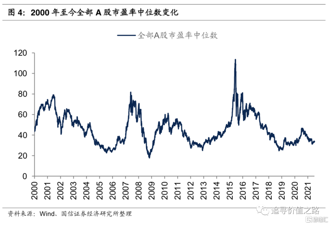 从A股整体估值来看,截至2021年7月9日,全部A股市盈率(TTM)中位数为33.9倍(剔除负值,下同),位于自2000年以来26%的历史分位点,A股整体估值水平不高,明显低于历史中枢水平。从A股估值分化情况来看,A股市盈率75分位数和25分位数的比值为3.2倍,处于2000年至今历史分位数81%位置,估值分化程度自5月中旬以来持续上升,仍处于较高的历史分位数水平。