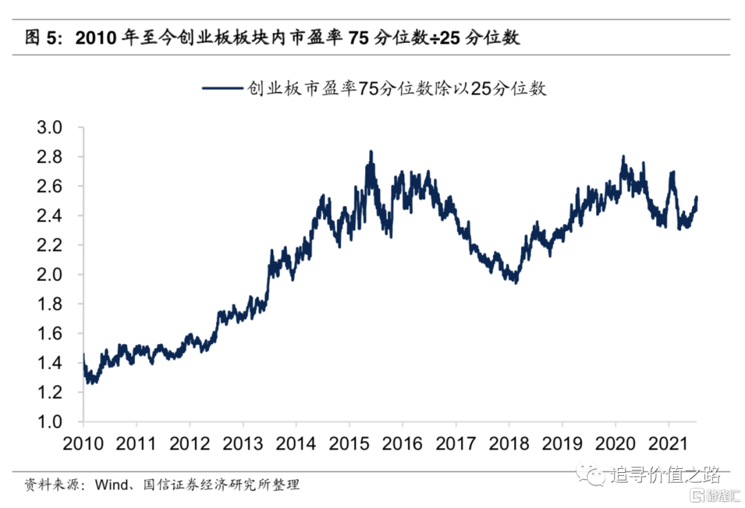 今年3月以来A股呈现明显的结构化行情,以创业板指为代表的成长股大幅跑赢以上证50为代表的价值股。截至2021年7月9日,创业板市盈率(TTM)中位数为47.5倍,当前估值水平处于自2010年以来的35%历史分位数附近。从创业板估值分化情况来看,创业板板块内市盈率75分位数和25分位数的比值达到了2.5,处于自2010年以来的80%历史分位数位置。较3月中旬的2.3倍明显分化加剧。从创业板相对全部A股估值水平来看,创业板相对市盈率(创业板市盈率中位数除以A股市盈率中位数)为1.40,处于历史分位数76%位置。自3月中旬以来亦有明显提升。