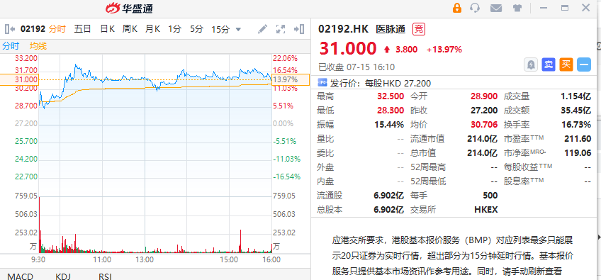 华盛资讯7月15日讯,今日三只新股挂牌上市,互联网医疗企业-医脉通(02192.HK)首挂收涨13.97%,一手账面浮盈1900港币,全日成交额35亿港币,最新总市值214亿港元;